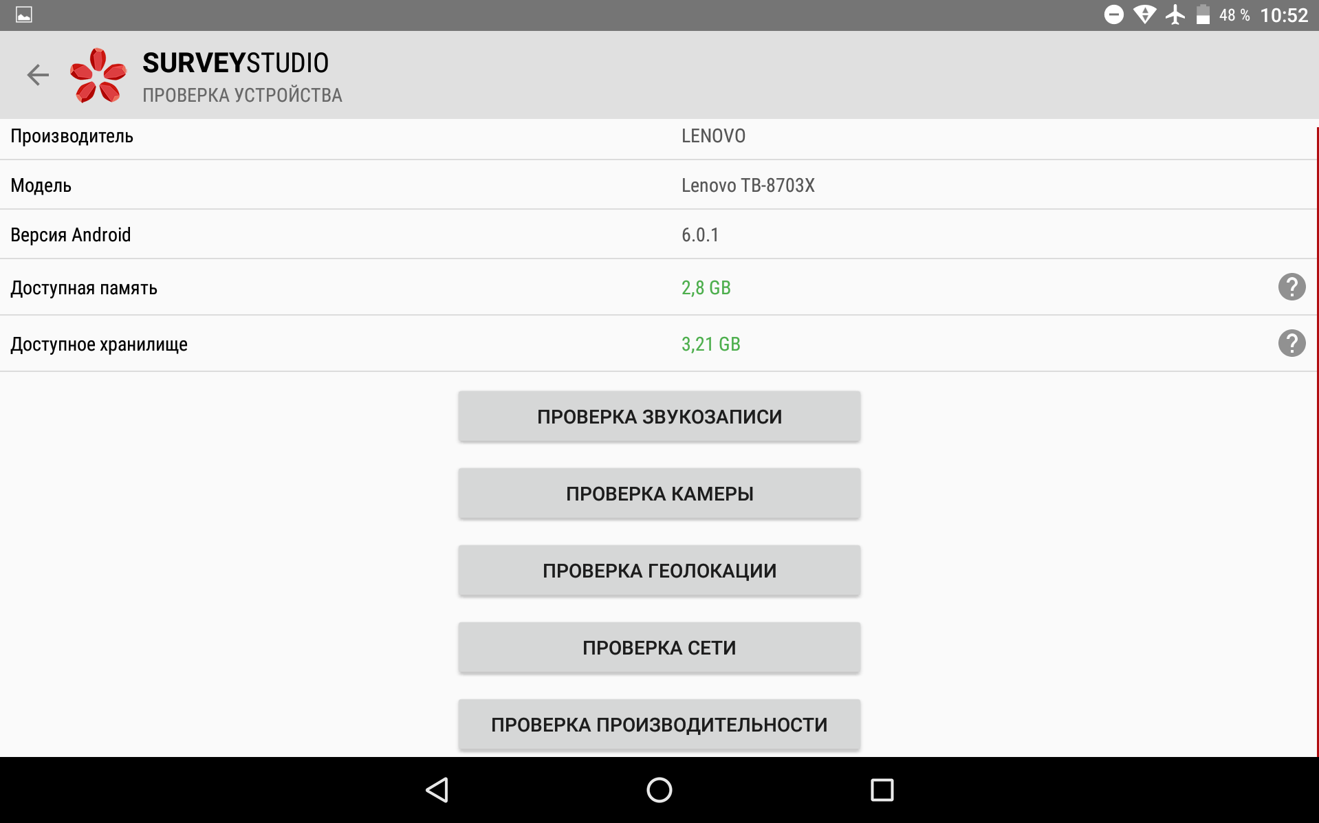 Необходимо убедиться, что приложению доступно более 1,5 Гб памяти, есть место для сохранения интервью, а также работают все функции: запись звука, камера, GPS и планшет в целом достаточно производительный.