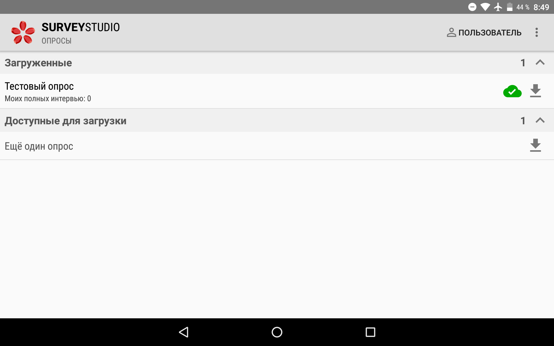 На экране со списком доступных опросов нажмите на необходимый вам опрос, чтобы скачать его. Нажав и удерживая палец на загруженном опросе, можно открыть его контекстное меню, с помощью которого опрос удаляется.