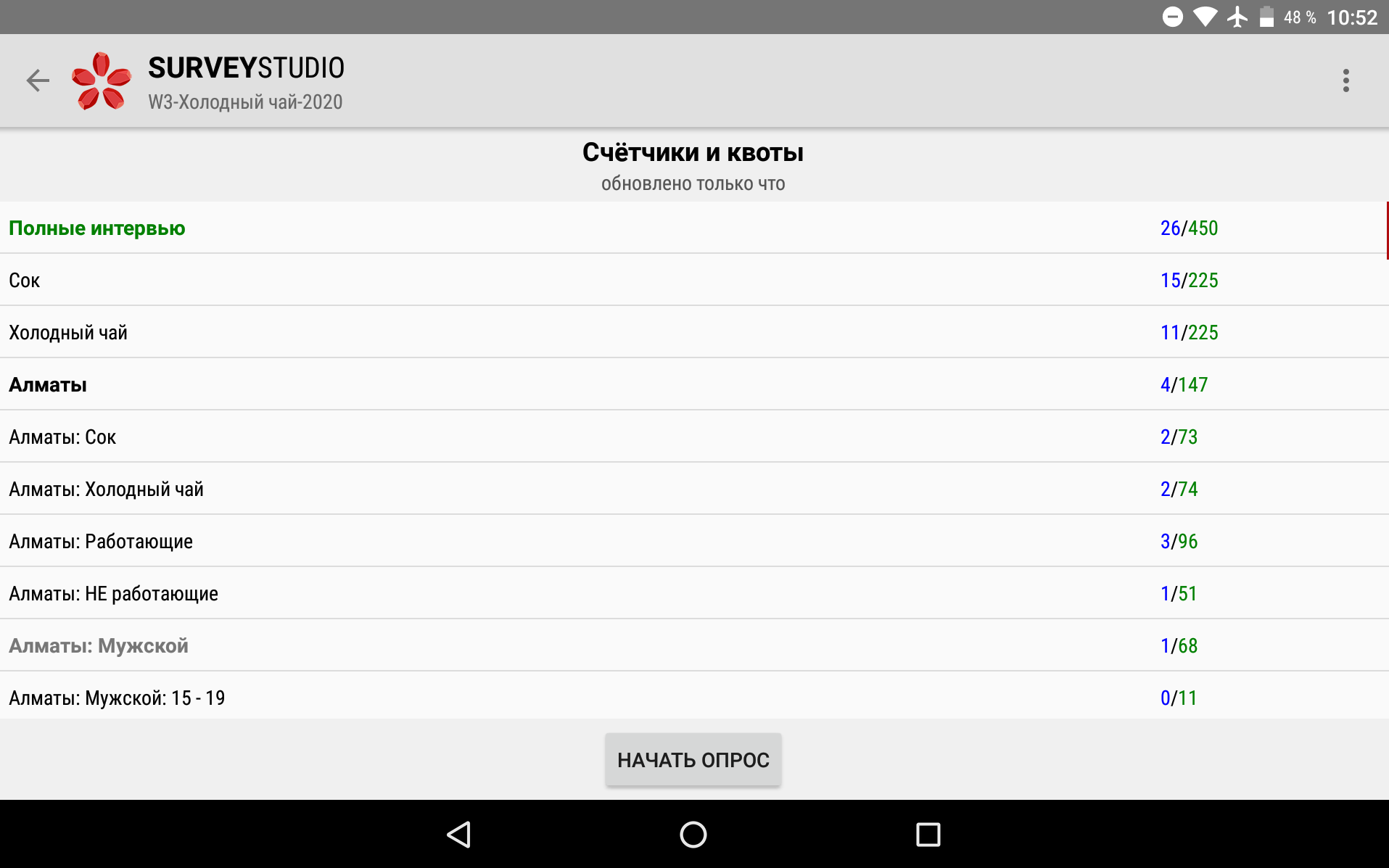 При нажатии на загруженный опрос открывается его экран. Здесь отображаются квоты, которые требуется соблюсти. Первое число - сколько интервью уже сохранено по квоте, второе - сколько нужно.