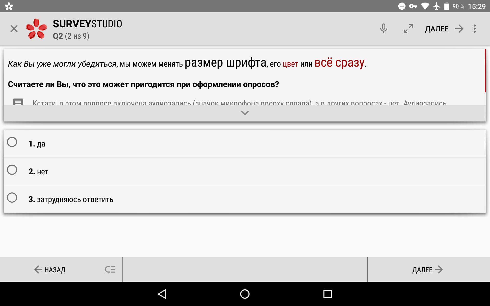 В правом верхнем углу всегда есть, как минимум, две кнопки: для перехода к следующему вопросу (Далее) и вызова контекстного меню анкеты (три точки). В зависимости от размера экрана в этом меню могут находиться дополнительные функции, кнопки которых не поместились на верхней панели, например, изменение размера текста анкеты, переключения вопроса в режим просмотра респондентом и другие. Также на панели может отображаться иконка микрофона, информирующая об осуществлении аудиозаписи.