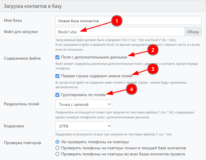 Вы можете дополнять базы в процессе работы при необходимости. Для этого при загрузке новых контактов укажите точно такие же настройки, которые были при загрузке первого файла.
