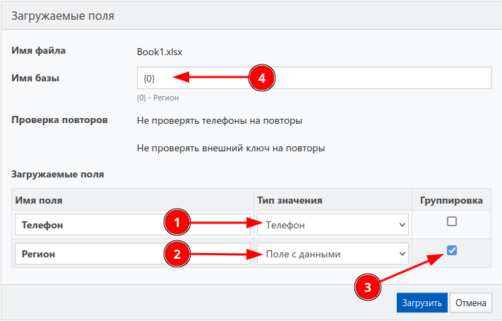 Загрузка баз с группировкой контактов