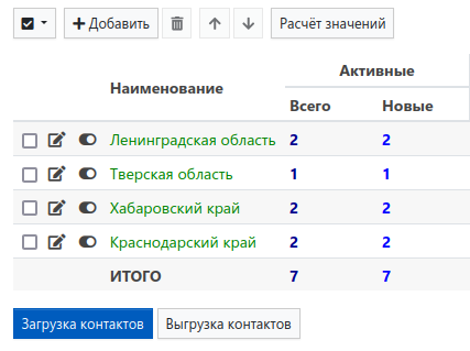 Нажмите кнопку Загрузить и дождитесь завершения импорта. В итоге будут созданы базы контактов для каждого региона с соответствующими телефонами: