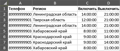 Вместе с группировкой контактов можно автоматически прописывать в свойствах базы какие-то параметры: время работы, метку и другие. Эти данные нужно добавить в загружаемый файл, для каждого контакта, например: