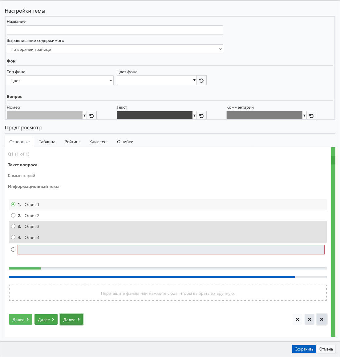 В блоке Настройки темы необходимо указать название вашей темы, и изменить стандартные настройки SURVEYSTUDIO по своему вкусу. В нижней части формы, в блоке Предпросмотр, вы можете видеть изменения в реальном времени.