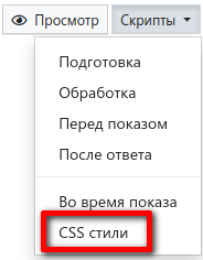 Если настроек темы оформления недостаточно, но очень нужно что-то быстро поменять, то можно воспользоваться стилями CSS, которые добавляются в редакторе, открывающимся из выпадающего меню Скрипты редактора анкеты: